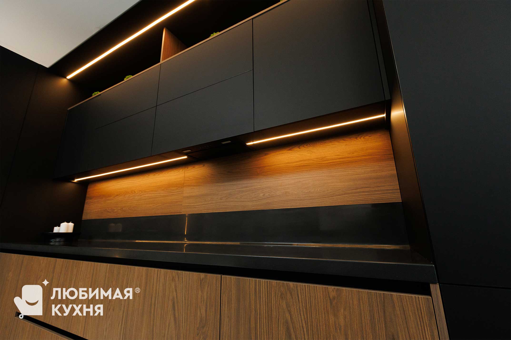 Кухня выполнена в современном минималистичном стиле с акцентом на контраст фактур и света. Матовые тёмные фасады сочетаются с тёплым древесным оттенком, создавая уютную и статусную атмосферу. Открытые ниши с декоративной подсветкой добавляют глубину и визуальную динамику, подчёркивая архитектурность композиции. Лаконичные формы и скрытые ручки делают интерьер строгим, стильным и функциональным.